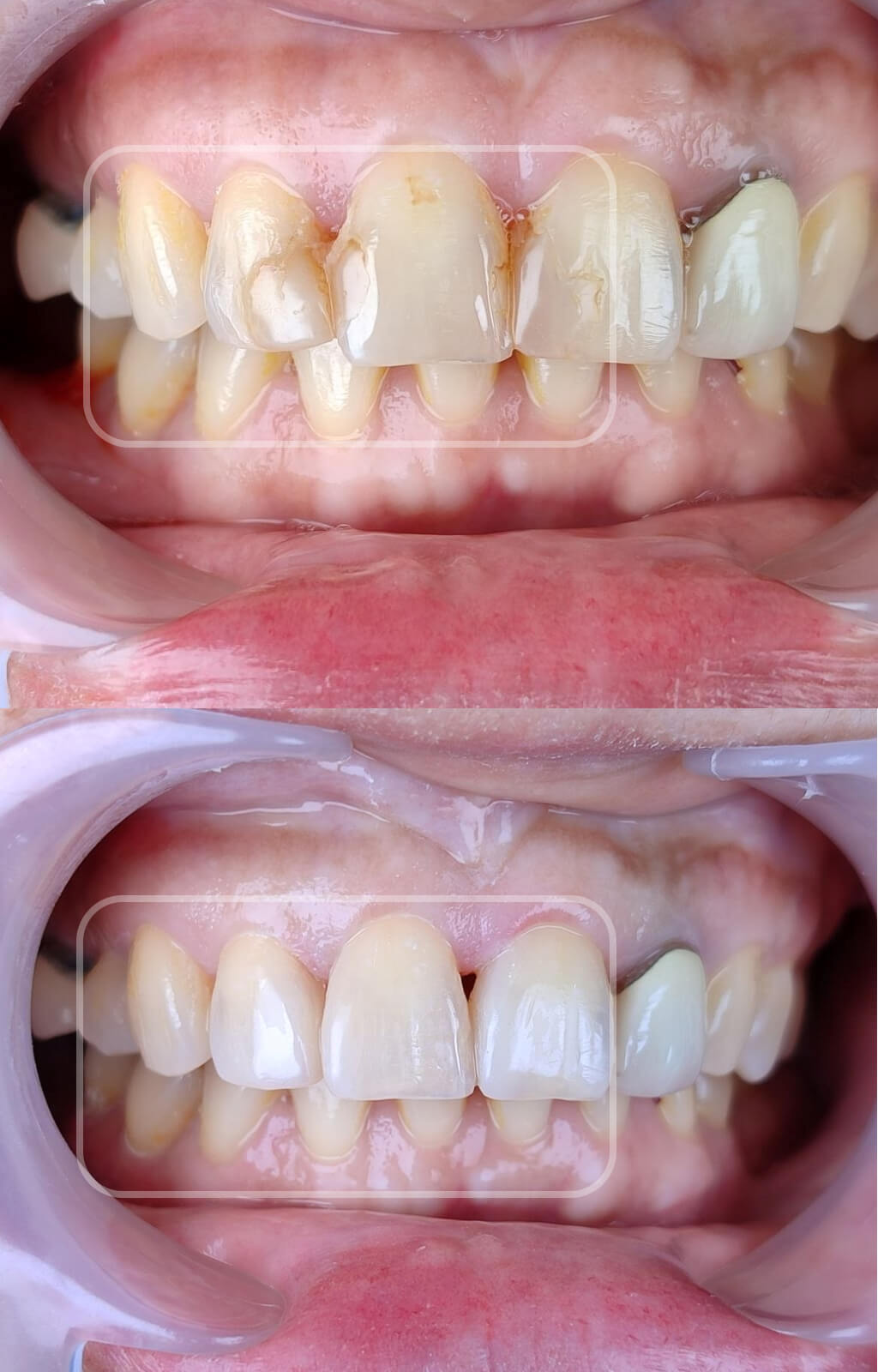 Stained and yellowish teeth were brightened with professional whitening treatment for a cleaner, whiter smile.
